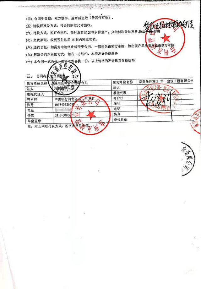 秦皇島開發(fā)區(qū)第一建筑工程有限公司與我公司,2016年簽訂秦皇島開發(fā)區(qū)引青供水工程項目防腐管道合同,我們已最優(yōu)質(zhì)的產(chǎn)品質(zhì)量,順利愉快的完成了這次合作,感謝客戶對我們的信賴,我公司將一如既往再創(chuàng)輝煌