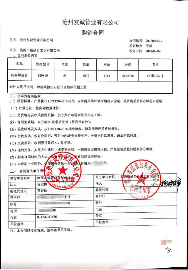 2018年9月我公司與沂州水務(wù)集團(tuán)臨沂市盛泉自來(lái)水有限公司簽訂TPEP防腐螺旋鋼管購(gòu)銷合同,DN800內(nèi)外防腐鋼管4000米,感謝張總的信任,與貴公司的合同讓我們公司在自來(lái)水管道領(lǐng)域有了一個(gè)新的突破,歡迎各界領(lǐng)域客戶前來(lái)合作