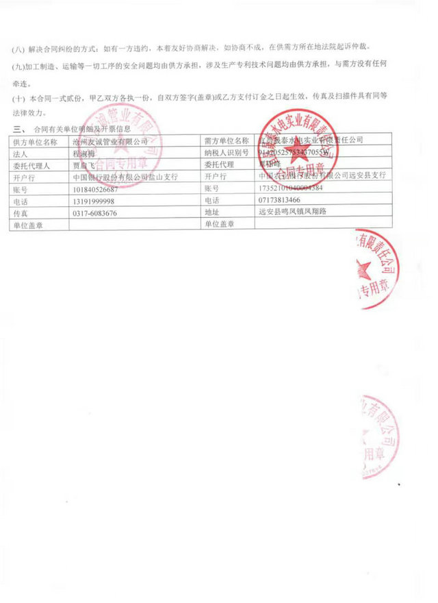 2019年10月23日友誠管業(yè)有限公司于宜昌市晟泰水電實業(yè)有限責(zé)任公司簽署了柔性承插口連接涂塑鋼管,從開始于譚總交談到來廠里考察,譚總對我們非常的信任認(rèn)可,我們一如既往的做好每一個業(yè)務(wù)